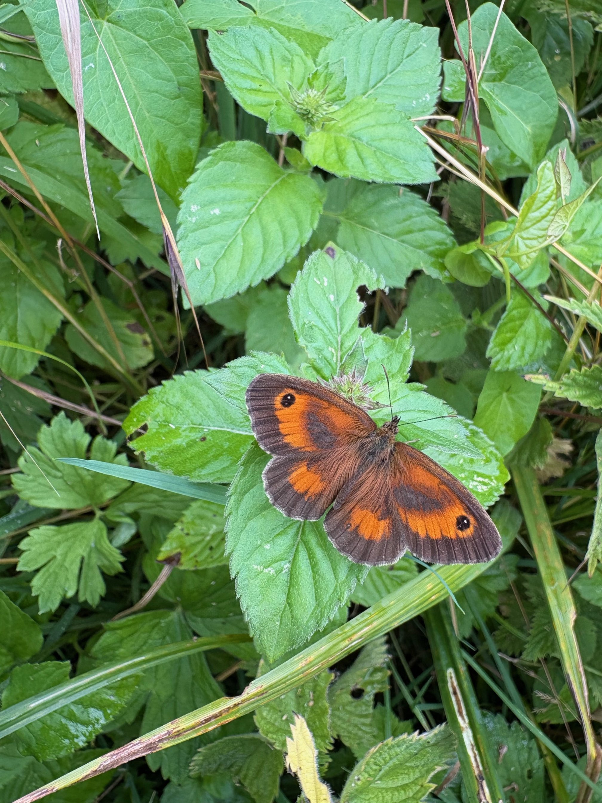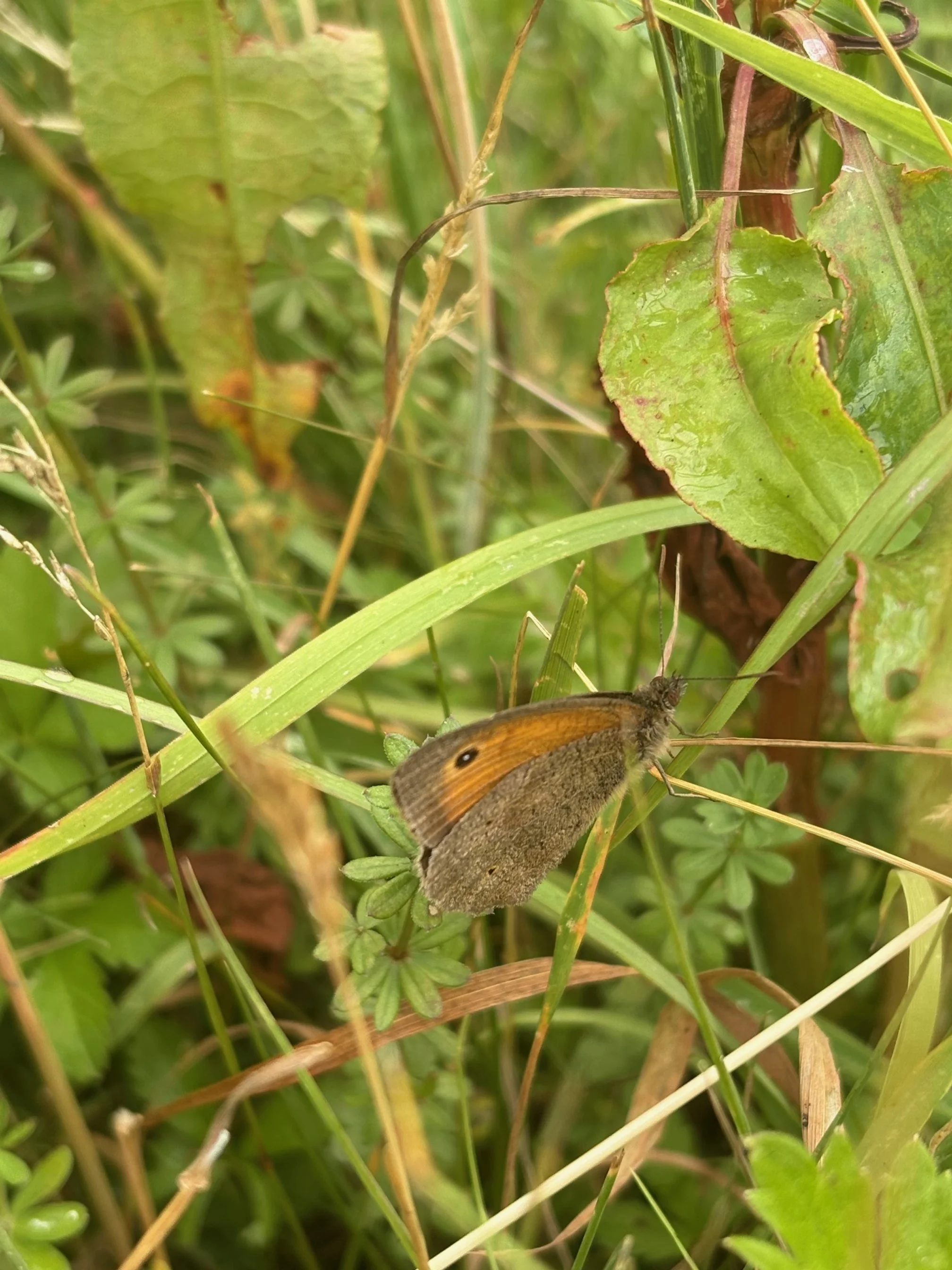 We walked into Meadow 3 and saw absolutely nothing but as we began to criss-cross the field, we were rewarded by seeing a variety of butterflies. Ringlets, Gatekeepers, a Common Blue, a Painted Lady, Meadow Browns. One of the main highlights of our walk was to find a Peacock butterfly sleeping on a piece of grass (so that only the dark underside of the wing was showing). We photographed, stared at, discussed and finally moved on and in all that time the butterfly slept.